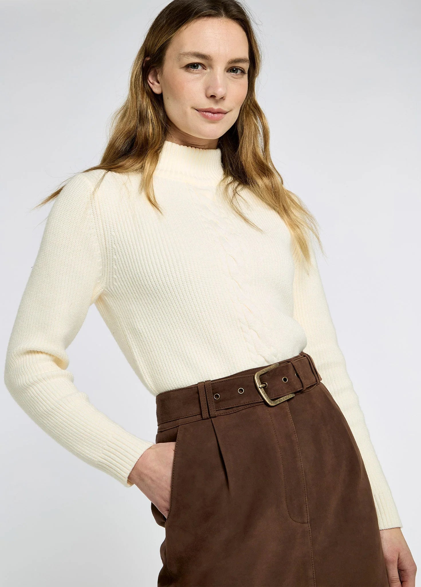 A beautiful investment piece, Dubarry's Sullivan knee length skirt will be with you for years. Soft walnut goat suede is fully lined and features front pleats for a comfortable fit. Pockets add a relaxed touch to this sophisticated skirt which can be dressed up or down with your favourite shirting or knitwear.